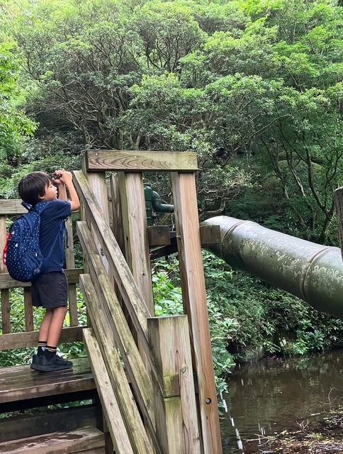 前日までの豪雨の影響で十国峠からのハイキングコースは断念。それでもビジターセンターでクラフト体験をしたり、水楽器や山の音楽隊といった昔から子ども達に大人気のアスレチックを楽しむことができました。