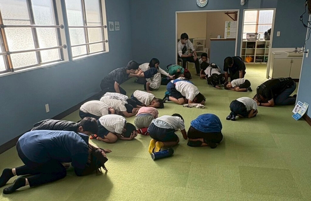 頭を守るための「ダンゴムシのポーズ」。この後は避難場所の清水町総合運動公園へ避難しました。「お・は・し」も意識できたね。